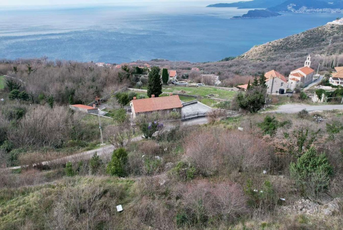 Sa parcele se pruža panoramski pogled na more, ostrvo Sveti Nikola i Budvu. Najbliža plaža je udaljena 7 minuta vožnje, dok je Budva na 15 minuta vožnje.